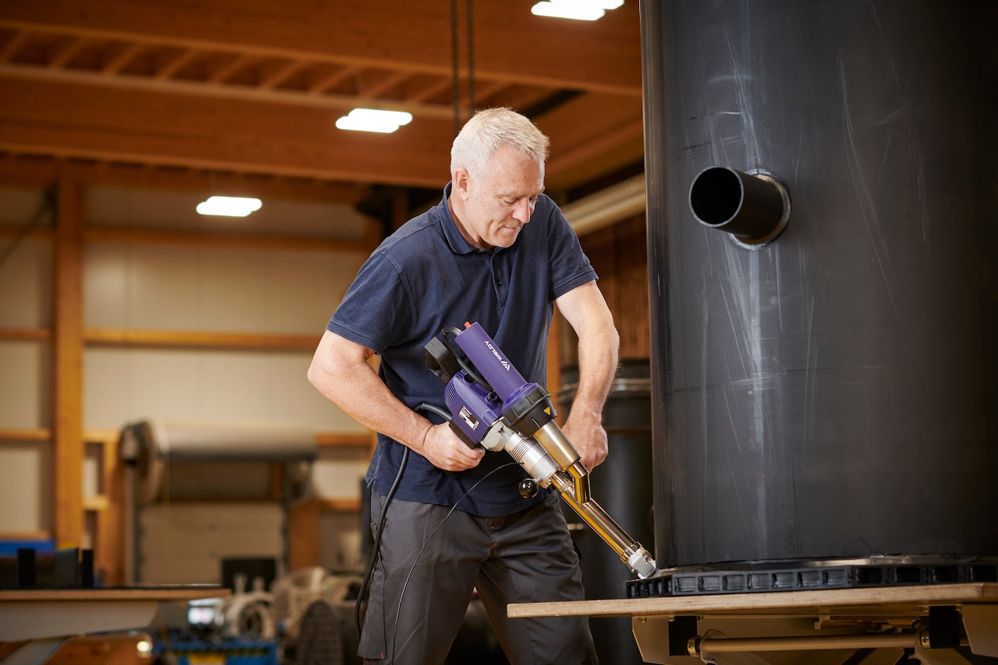 With the booster EX3, the welding rod can be drawn in from both the left and right sides, which facilitates plastic welding work in tight spaces. The booster EX3 extrusion welder has a total of three handles: a handle with lockable drive button, a rotating push handle at the rear of the extruder and a side handle that can be mounted on the left or right as required. This handle facilitates precise guidance of the booster EX3 extrusion welder. The longer design and variable handle positions of this welder allow operators to maintain good posture while working and have good control of the extruder during plastic welding. The Weldy booster EX3 extrusion welder is used for high-quality processing of polyolefins and thermoplastics PE and PP. In contrast to the short and compact booster EX2, the booster EX3 with its maximum output of 3.4 kg/h/7.5 lbs/h is ideal for work that requires a lot of standing. The hand extruder booster EX3 is also successfully used in tank and container construction for sheet thicknesses up to 15 mm/0.6 inches. If thicker welds are required, a larger extruder is more suitable. The durable transport case included in the scope of delivery ensures that the hand extruder and accessories are safe and free of dust/debris.