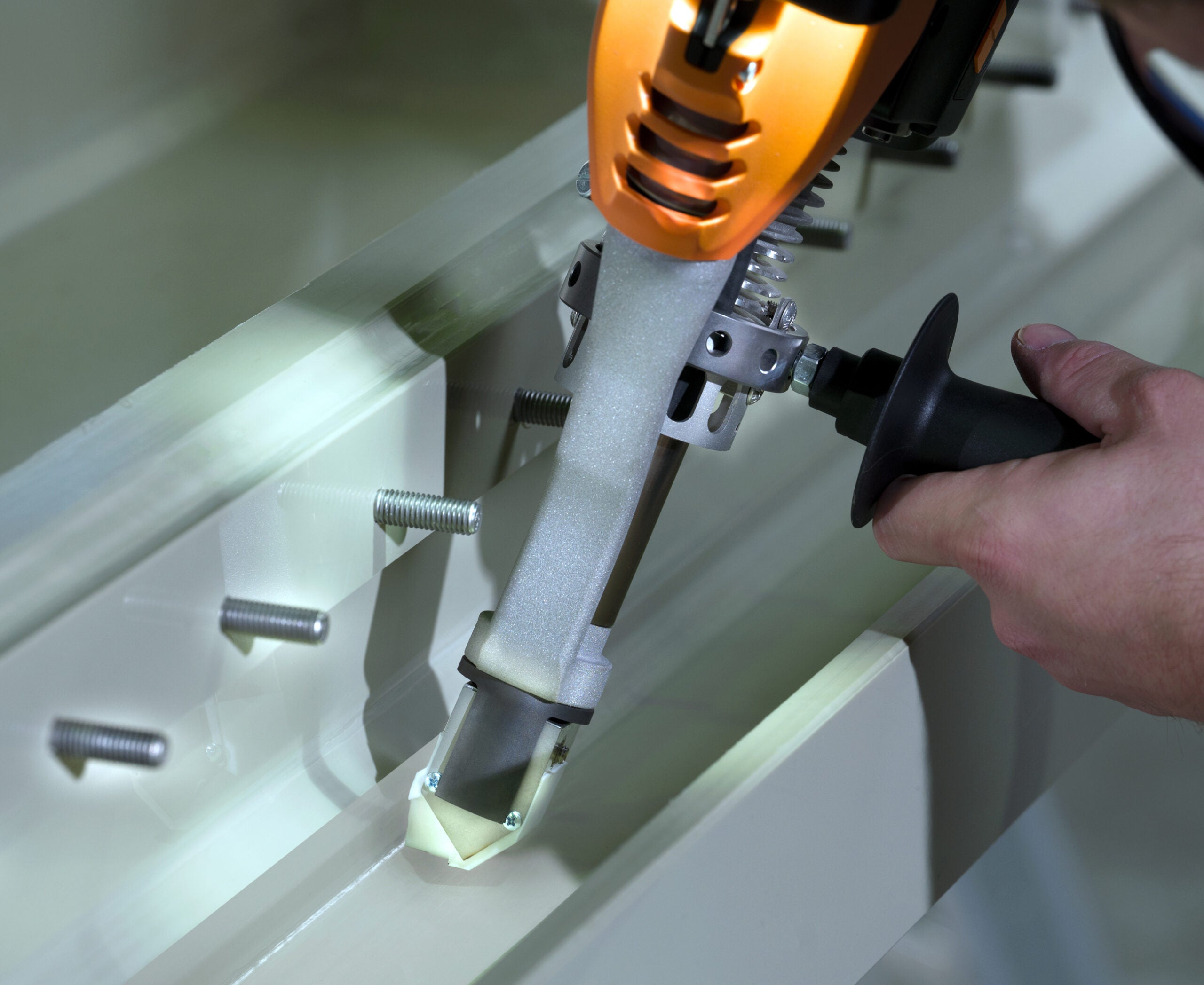 Silent, light-weight, small and variable usabilities. The „small“ workaholic beneath our MAX-extruders is completely brushless and therefore very low-wear. Long working times are its speciality. With this digitally controlled extruder you can easily weld 15mm sheet thickness, or even 20mm material thickness. With the same dimensions as MAK-18, this extruder has an output of 2.5kg/h instead of up to 2.2kg/h. Integrated high-power LEDs ensure good illumination in the work area. In addition you save energy when the device goes into standby when not in use or even switches off the preheating fan after it has cooled down. For the use of this machine a „Powerbox“ is needed.