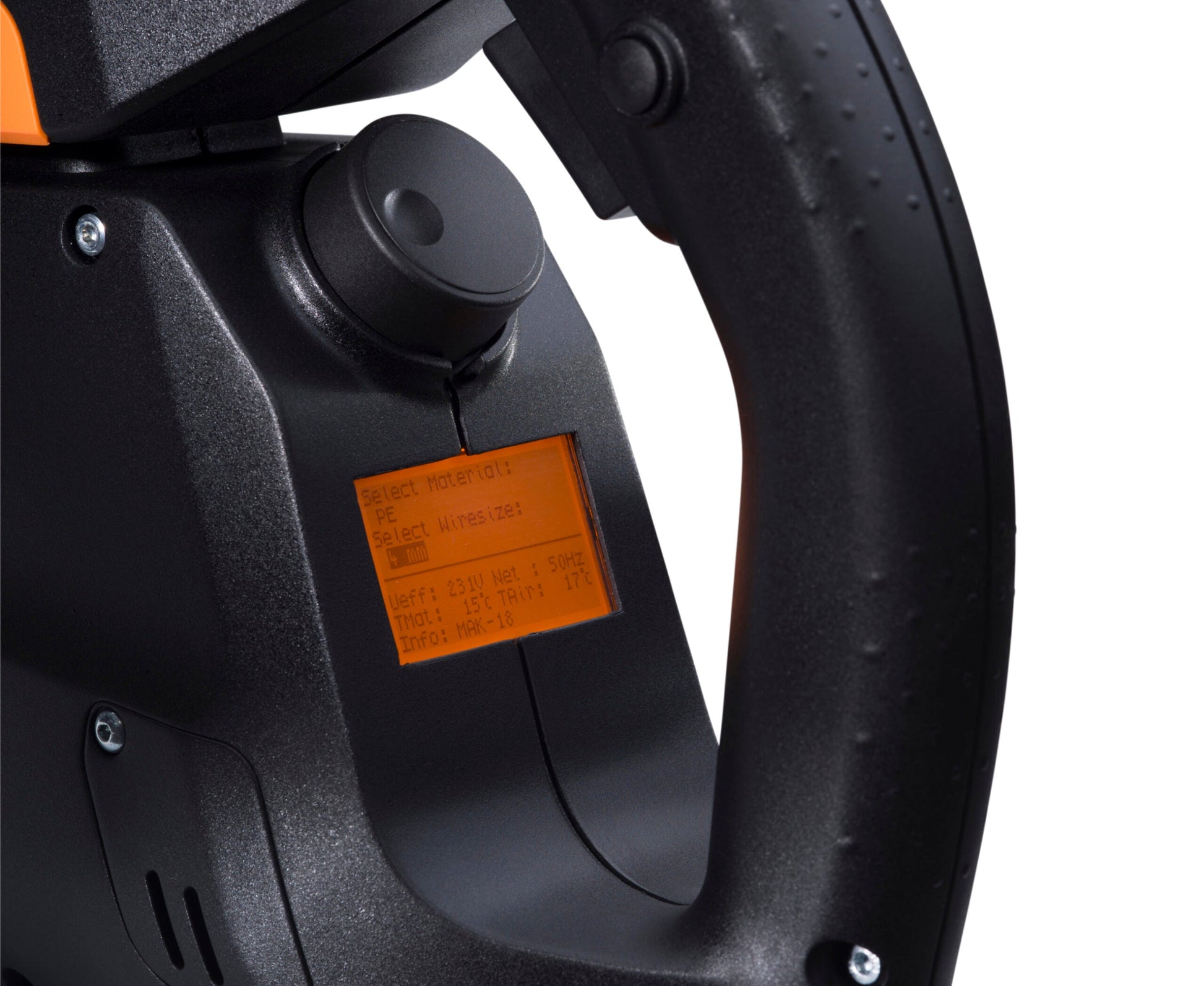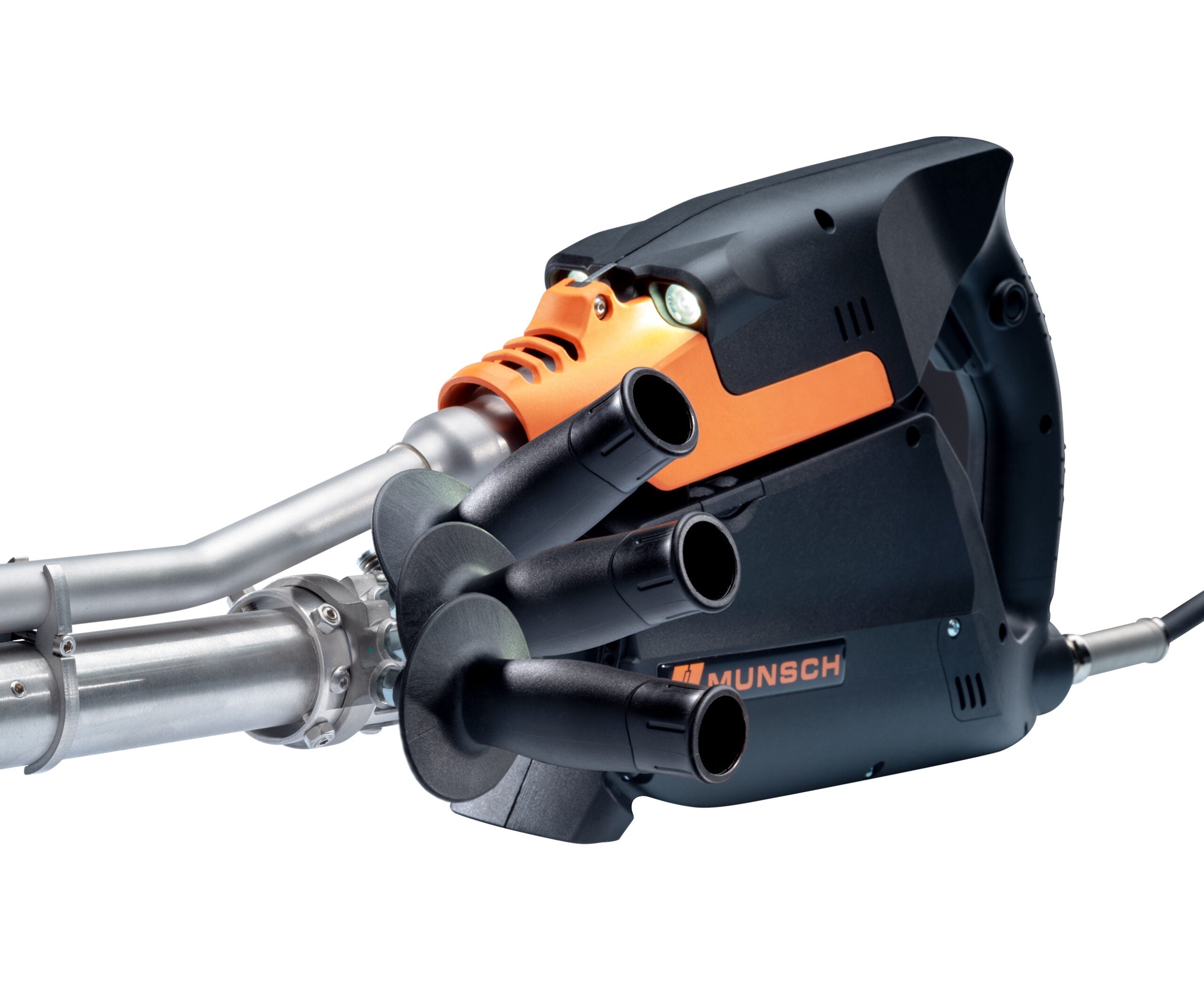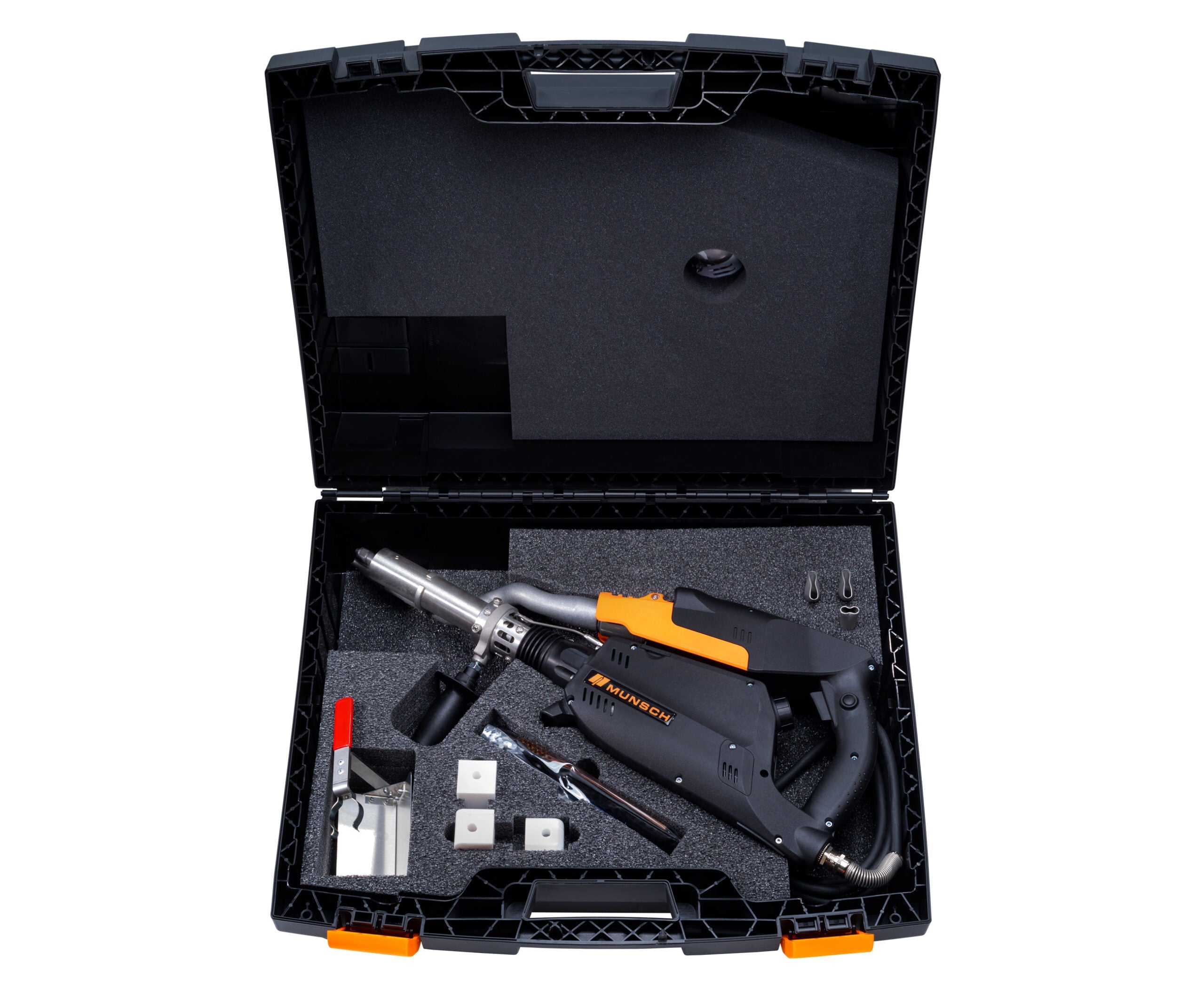 Silent, powerful and still light-weight. Up to 30mm material thickness are not an issue for this extruder with less than 8kg. This version is, due to the preheating on the side, primarily designed for container engineering. An infinitely variable handle and numerous holding possibilities make welding of spaces with difficult access. Integrated high-power LEDs ensure good illumination in the work area. In time of non-usage of the machine, it goes into a standby-function, which results in high reduction of noise; in addition, you save up to 60% energy. When the machine has fully cooled down, the blower even switches off.