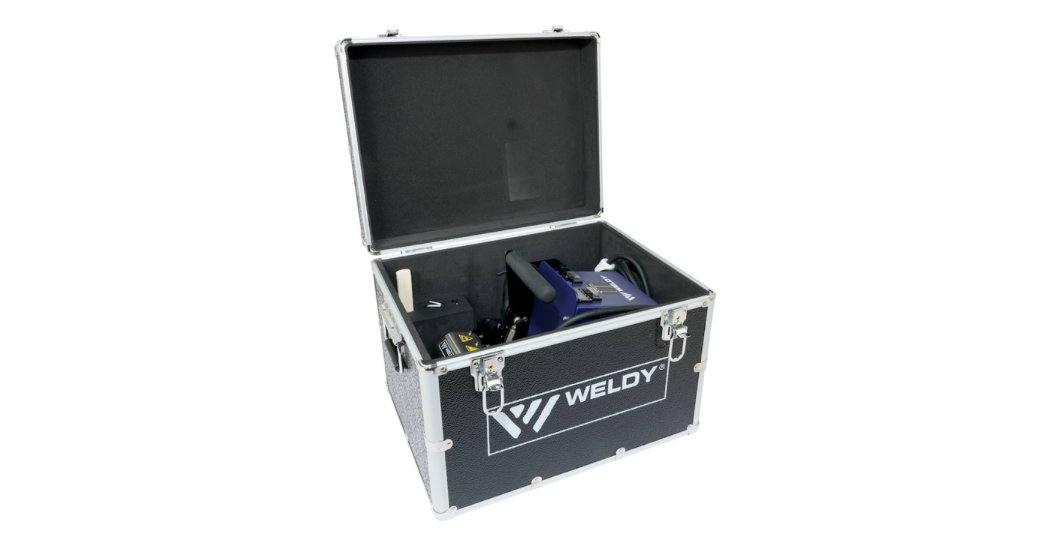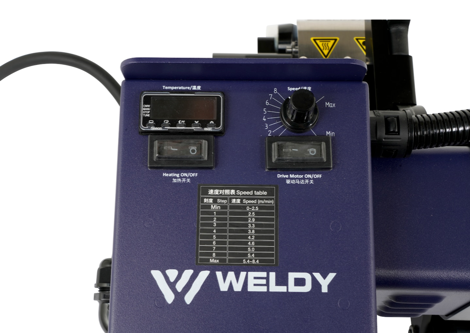 All keys are labeled bilingually (English and Chinese). Heating and motor can be turned on and off directly with the controls, which enables fast, safe and intuitive operation. By means of a temperature sensor placed in the middle of the wedge, the welding temperature can be precisely controlled at any time during overlap welding. The WGW 300 automatic welder is equipped with a powerful and durable motor. Its strong drive rollers ensure a secure grip when reliably welding membranes on inclines that are almost vertical. Thanks to the large rollers, this Weldy hot-wedge welding machine achieves high-quality welds on both even and uneven surfaces. The WGW 300 from Weldy is inexpensive to purchase and manages the balancing act between price and quality, making it stand out positively in its market segment. The automatic welding machine is suitable as an inexpensive, entry-level tool for plastic welding in mines, landfills and various engineering projects. The robust hot-wedge welding machine, WGW 300 from Weldy, weighs 15 kg and can be easily stored and transported in the storage box supplied. *A steel wedge is required for welding PVC geomembranes.